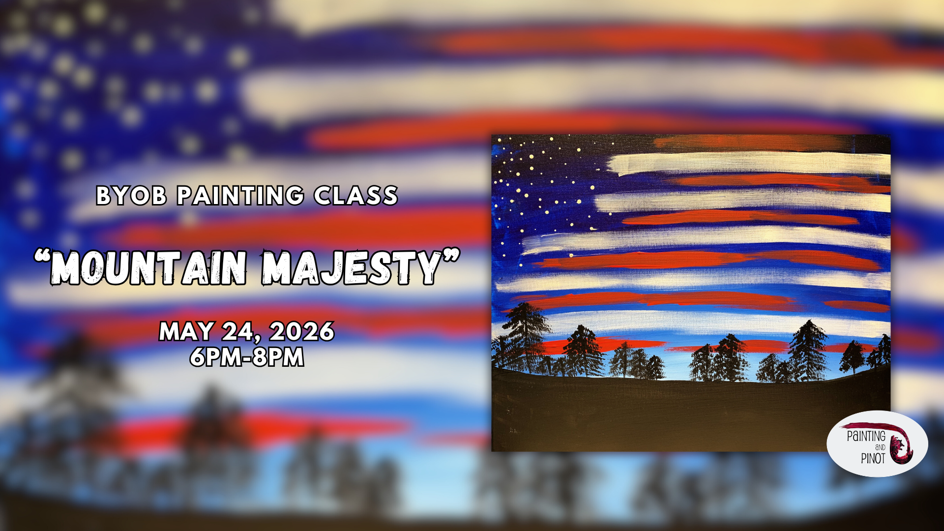 Join us for a BYOB painting class as we create Mountain Majesty, a landscape featuring an abstracted American flag sky above a dark tree line. This painting has a bold, high-contrast look while still being simple enough for beginners.