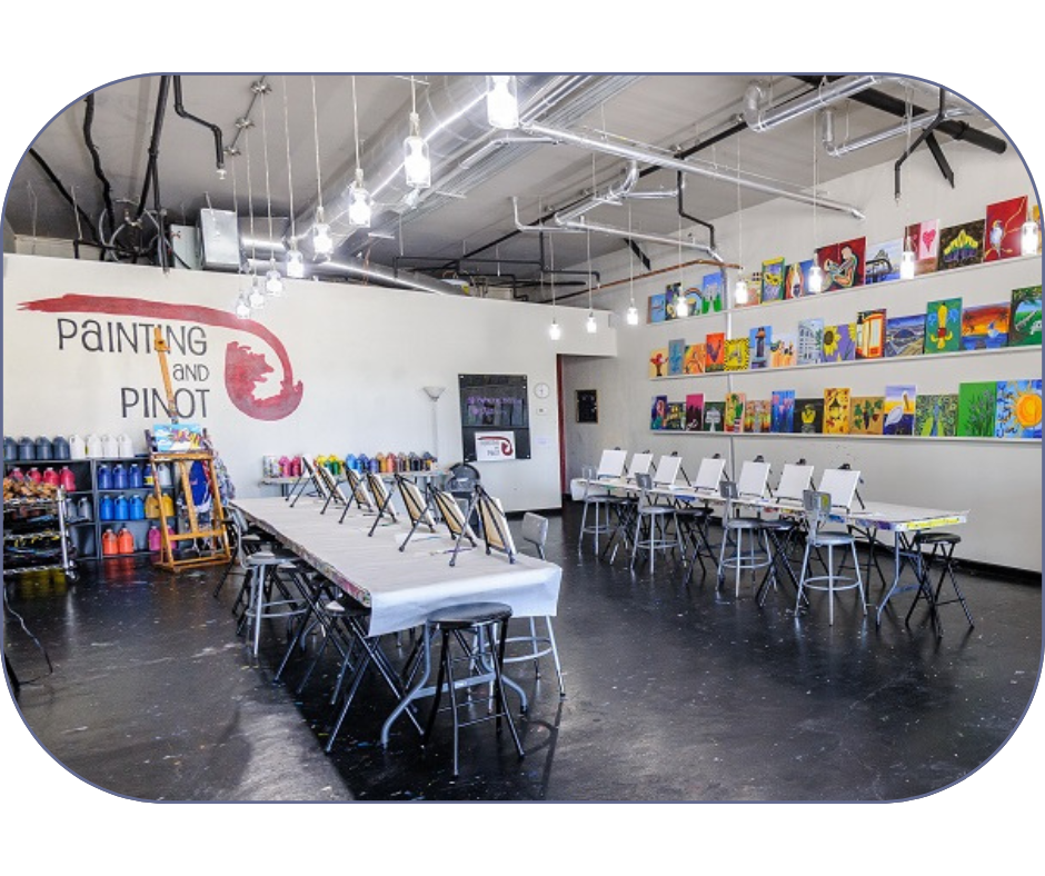 Guests can bring in anything they want to eat or drink during the party.  Guests MUST be 21 years old to drink alcoholic beverages.  Painting and Pinot will provide plates, napkins, cups, forks, and wine openers for your use.  The studio does NOT have ice.