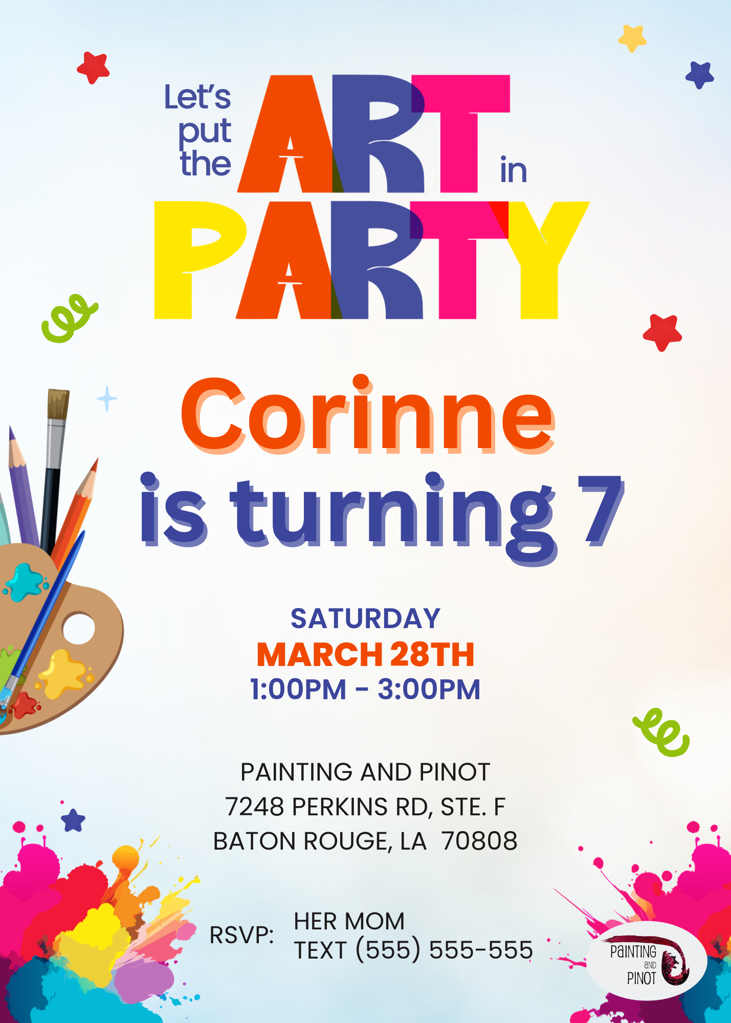 Sample Invite – You will receive a JPG of your custom invitation within 24 hours of booking your child’ painting party